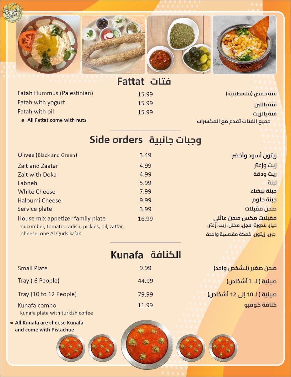 The side dishes, including the Fatah Hummus (CA$15.99) and delicious olive offerings (CA$3.49), showcase the freshness that defines Cheese and Olives. Drink options like the refreshing Mint Lemonade (CA$9.99) further elevate the dining experience.